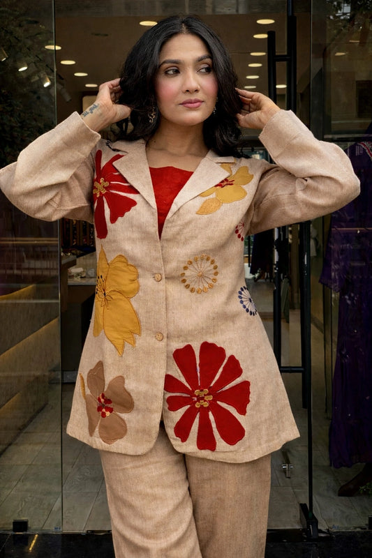 Beige Floral Applique Blazer Co-ord Set (Jacket,Inner & Pants)