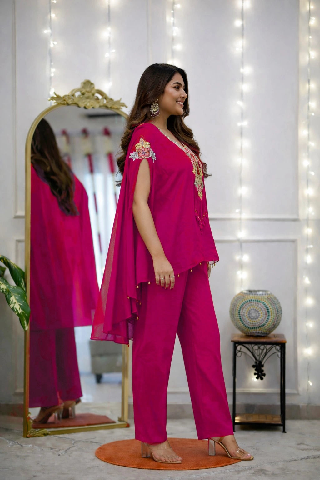 Vacation Vibes, Festive Shine. Steal the spotlight in our 'Tropical Glam' Cape Set. This vibrant hot pink ensemble is the definition of modern luxury. Featuring a flowy, kaftan-style top with dramatic open sleeves and a heavily embroidered neckline, it pairs perfectly with sleek straight-fit pants for a look that is both comfortable and chic.
